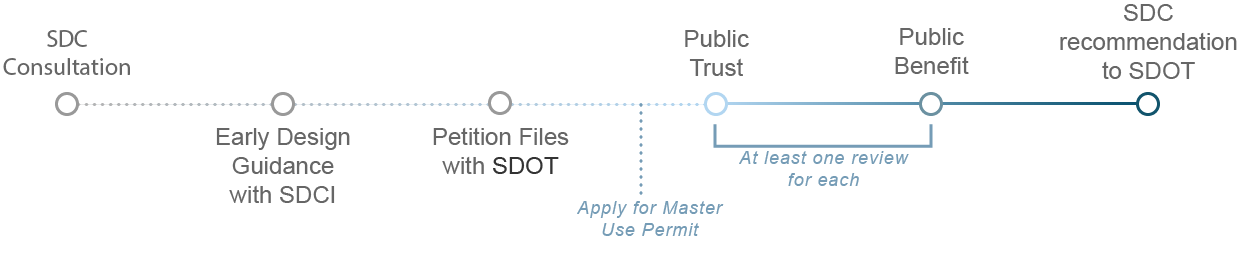 Information provided to us shall include all items outlined in Section 1 - Getting Start of the Seattle Design Commission Handbook as well as any additional information developed in conjunction with City staff or the applicant team. We will evaluate and then make recommendations on the impacts to the public trust functions of the rights of way impacted by the vacation request. We will vote on this phase of the project and will include recommendations and any conditions of approval.