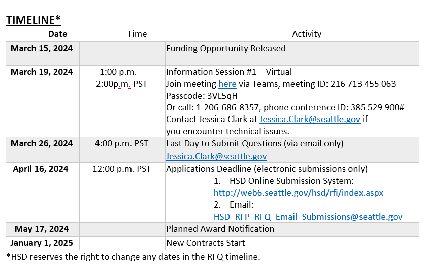 HSD will offer one virtual information session, which will be recorded and made available on HSD’s Funding Opportunities webpage. Any agency interested in learning more about this RFQ is encouraged to attend the session and ask questions. Attendance is not required.