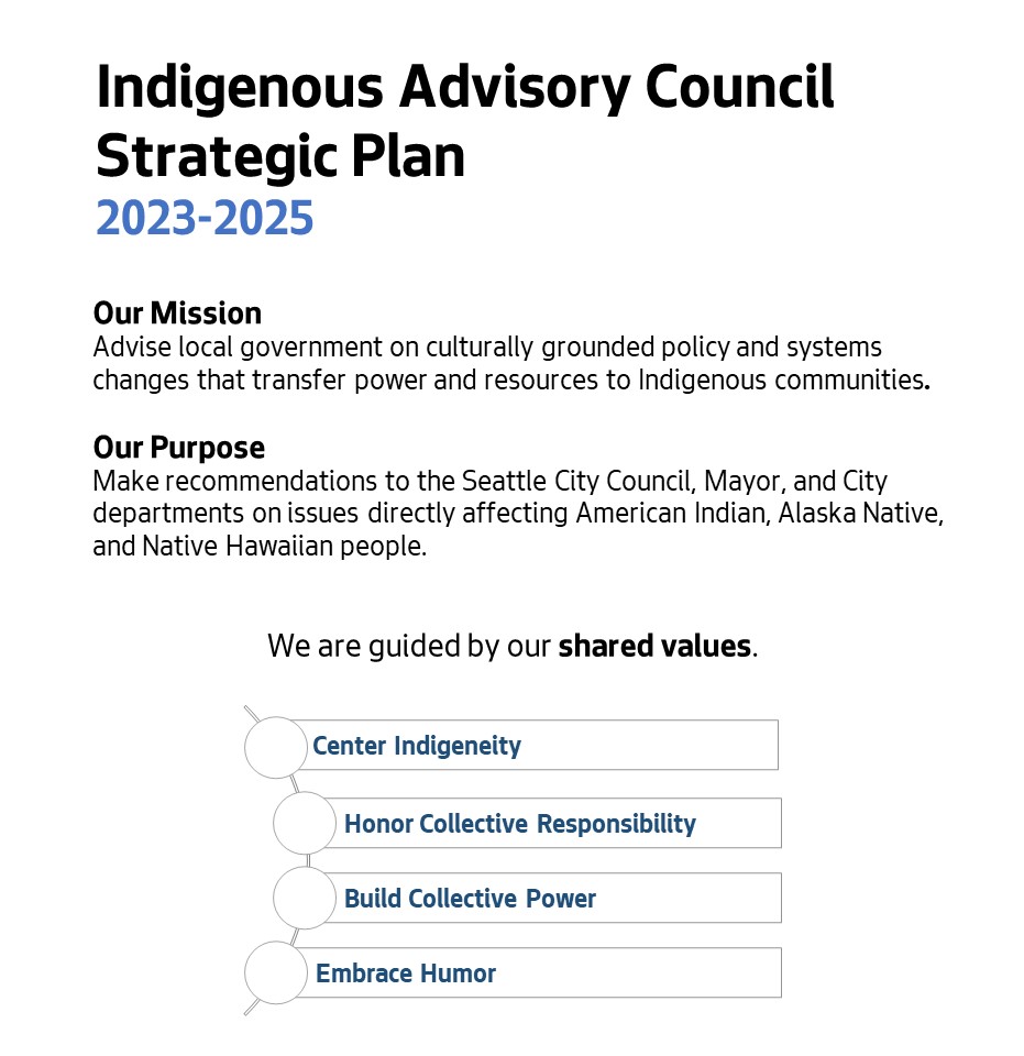 Ordinance 126512 describes that the Indigenous Advisory Council will further define and strengthen the City's unique political relationship with the Coast Salish tribal communities that are the original stewards of the land and waters of Seattle and work to fulfill trust and treaty obligations to the American Indian, Alaska Native, and Native Hawaiian people that reside in Seattle. Goals may include: