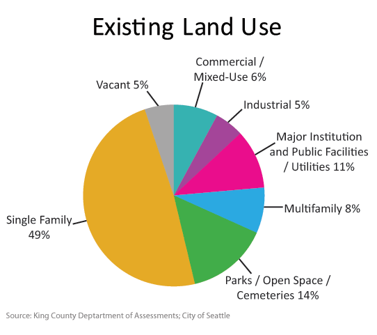 - Land use distribution: Seattle's land area remains mostly single-family in nature, but most residential development capacity, 93.5 percent, is in the multifamily zoning types with 73 percent in designated growth areas. View the existing land use pie chart.