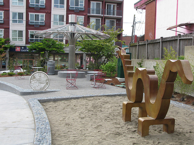 This park is a fun spot for play in the middle of the busy Chinatown International District neighborhood. Built in 1981 and renovated in 2012, the park offers an open lawn, picnic area, gathering spaces, beautiful landscaping and a new play area that offers varied play opportunities and equipment including drums.   An iconic bronze dragon sculpture created by artist Gerard Tsutakawa is beautiful and used as play equipment by children who frequent the park. Local Seattle artist Stuart Nakamura was chosen to create new art pieces for the renovated park. With the help of the community(children from the Denise Louie Education Center and seniors from Legacy House), Nakamura designed 3 different pieces to represent the different cultural elements in the neighborhood. The sculptures are a spinning top, I-Ching Coin and SepakTakraw Ball.