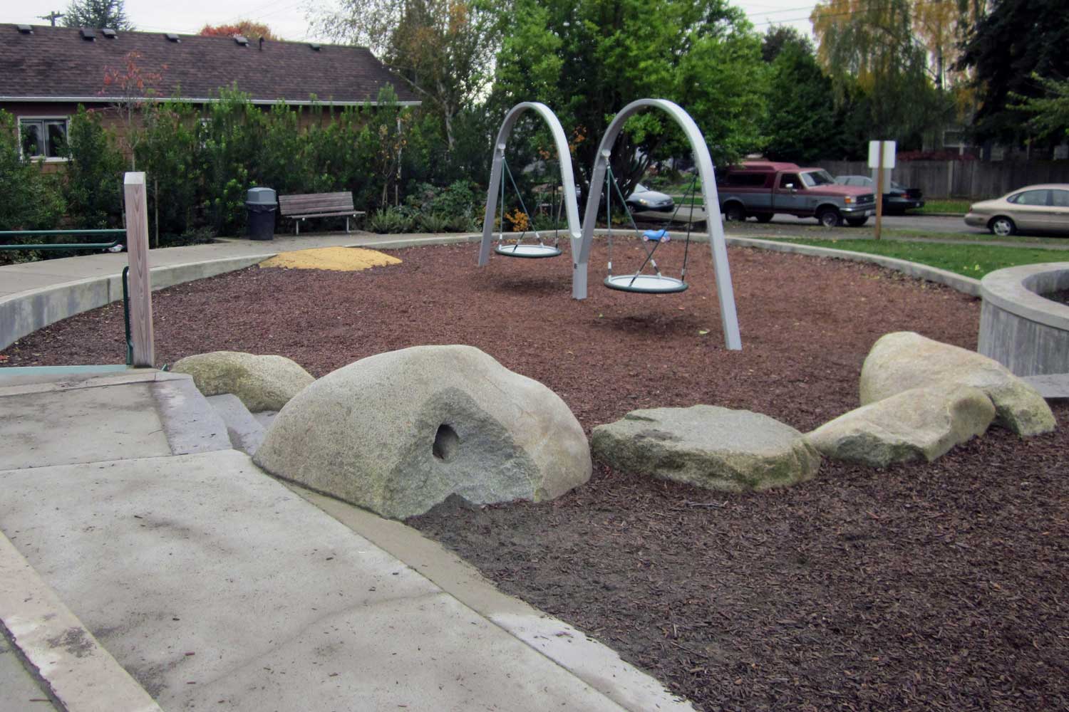 The park was named Kirke which means church in Norwegian. This name pays tribute to both the Norwegian heritage of the neighborhood and the history of the site. This site was home to the Church of Seventh Elect in Spiritual Israel for more than 90 years. This park has the historical ruins of the church incorporated into the gardens and play areas. There is also a P-Patch on the property.