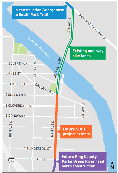- Provide smooth connections for people biking to the South Park Bridge, Green River Trail Extension, and other bikeways