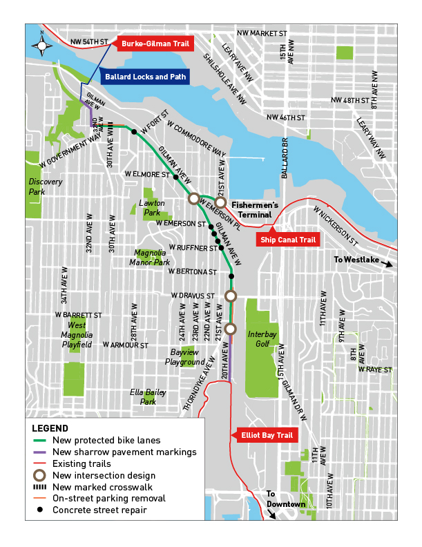 This project includes redesigning 20th Ave W, Gilman Ave W, W Government Way, and W Emerson Pl to include protected bike lanes and more intuitive and comfortable intersections that keep people moving. It adds 2-way protected bike lanes on the north and east side of the streets. There are on-street parking impacts on W Government Way.