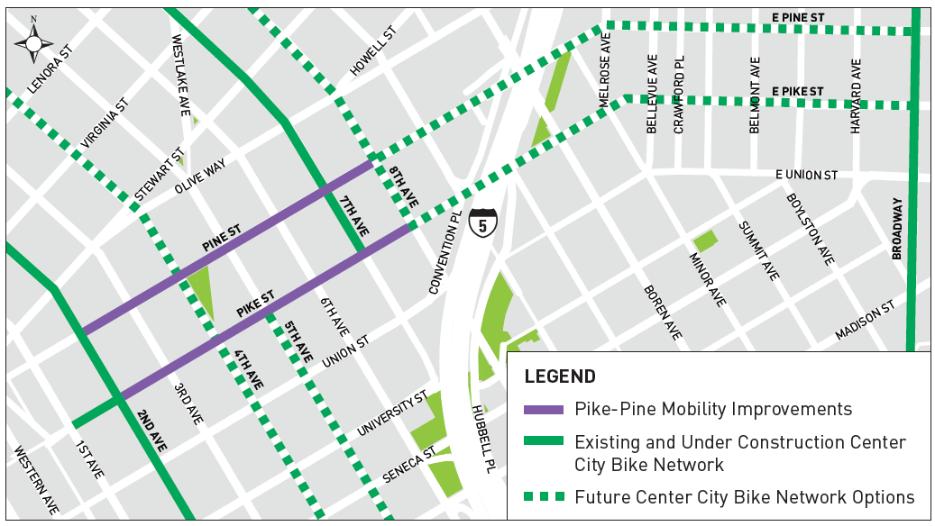 *Note: this map represents the project design. During September 2017 installation, new bike facilities were installed on Pine St between 3rd Ave and 6th Ave, and on Pike St between 2nd and 8th Ave.