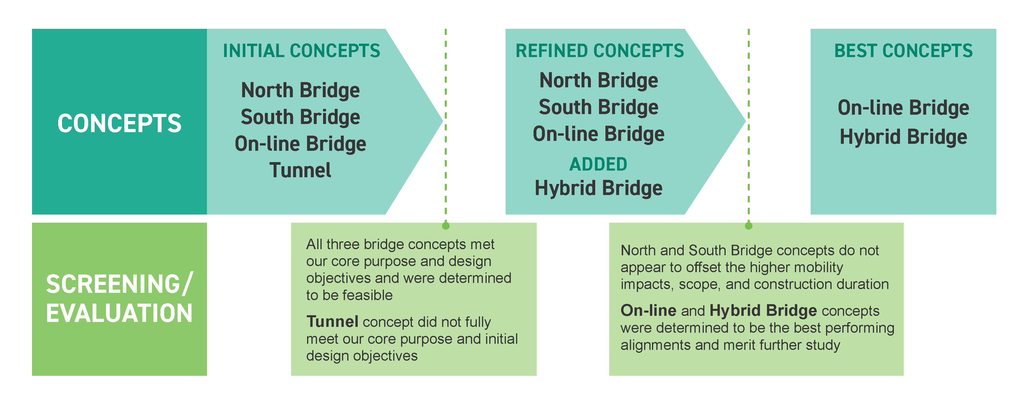 This graphic illustrates the process we used to arrive at our findings. We started with 4 location concepts (North Bridge, South Bridge, On-line Bridge, and Tunnel), and screened those for feasibility. We found that all three bridge concepts met the core purpose, design objectives and would be feasible to construct. The tunnel had some significant challenges and that's why it wasn't explored further. We then refined the bridge concept designs and added a Hybrid Bridge concept. We evaluated those concepts and landed on two that performed best and merit further study when the time comes.