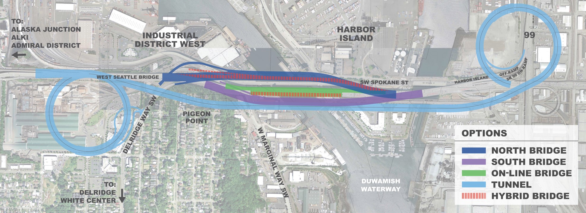 Our study focused on replacement location to determine which will best meet the needs of West Seattle and the region. Our team has researched and evaluated five replacement concepts within the vicinity of existing bridge, including: