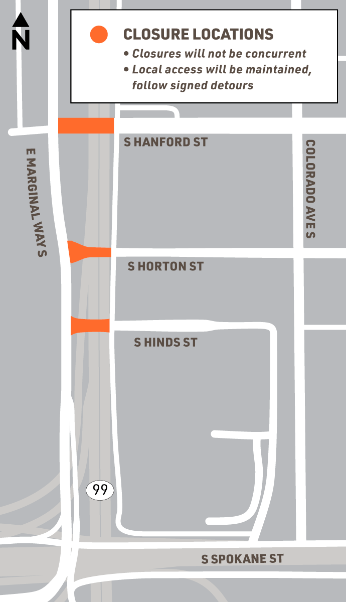 - Full street closures of S Hinds St, S Horton St, and S Hanford St at E Marginal Way S (see map below)