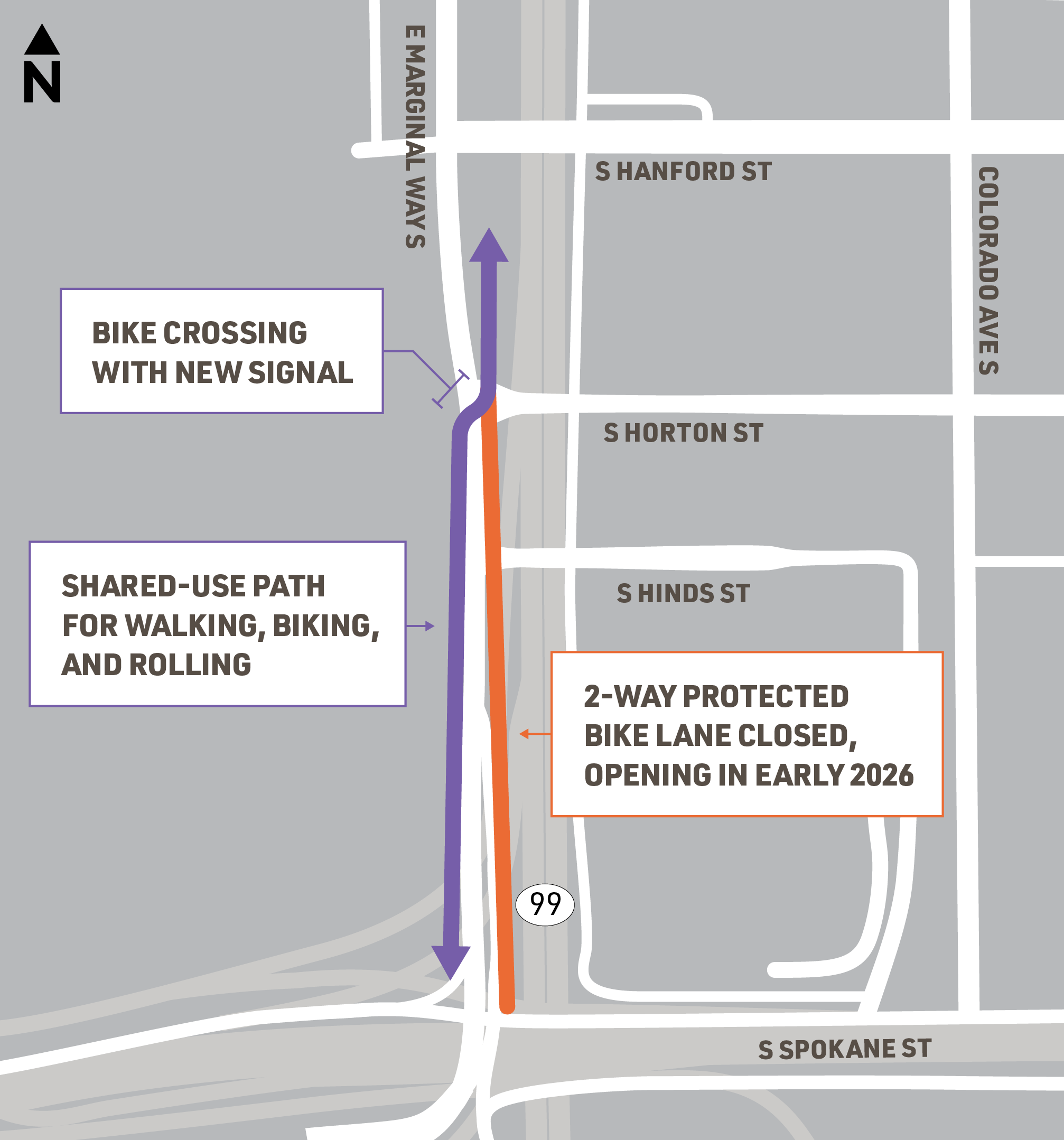 While we complete rail work, the section of bike lane on the east side of E Marginal Way S between S Spokane St and S Horton St remains closed. In this section of the corridor, people biking can use the shared-use path on the west side of the street. The shared-use path connects to the open 2-way bike lane using the new diagonal crossing at S Horton St (see the map below).