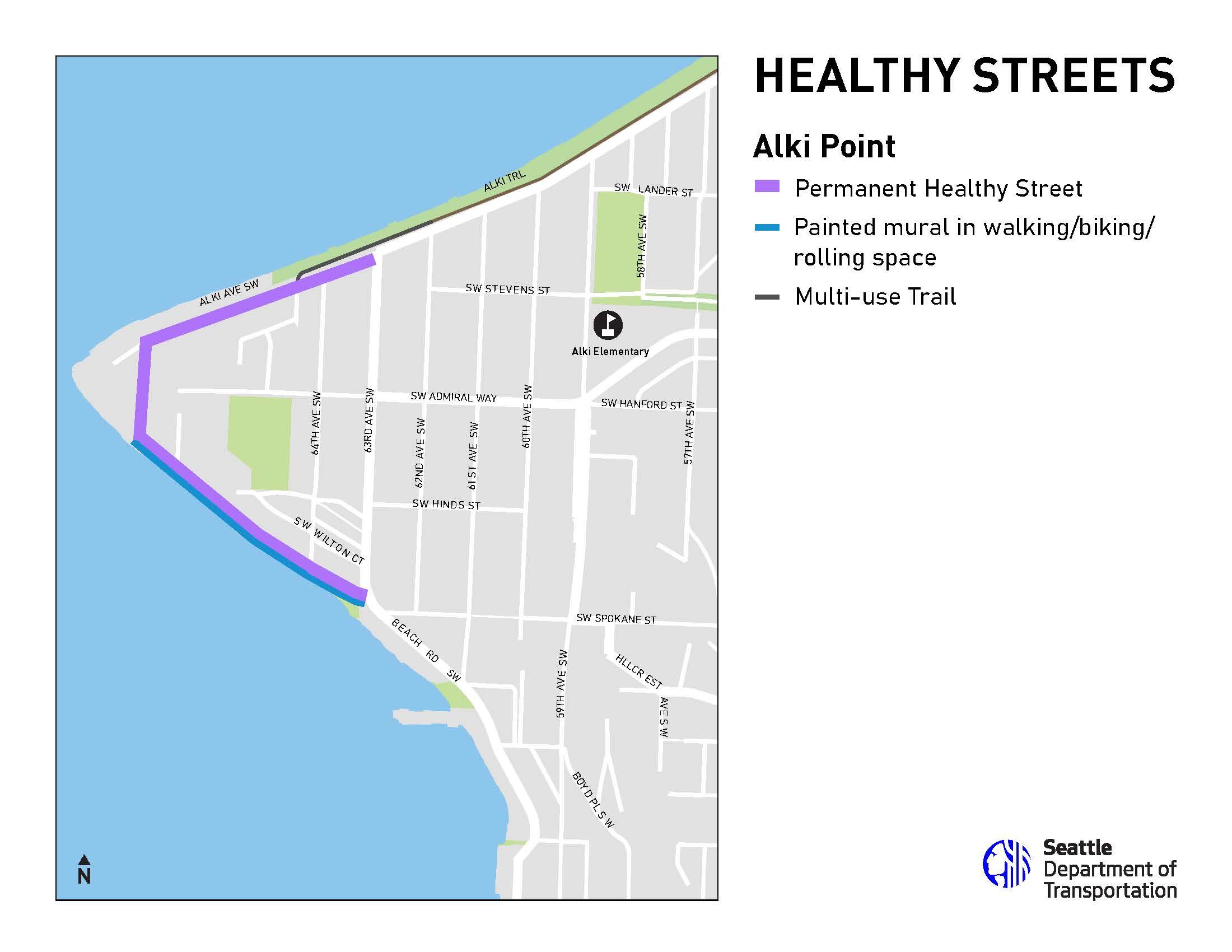 We’ll return in 2026 to install the remaining Healthy Street upgrades, including an extension of the walking and rolling path on Beach Dr SW to 63rd Ave SW and the painted mural in the walking/rolling path. We're completing the work in phases because the remaining elements require drier weather. The remaining upgrades are described in the Design Elements section below.