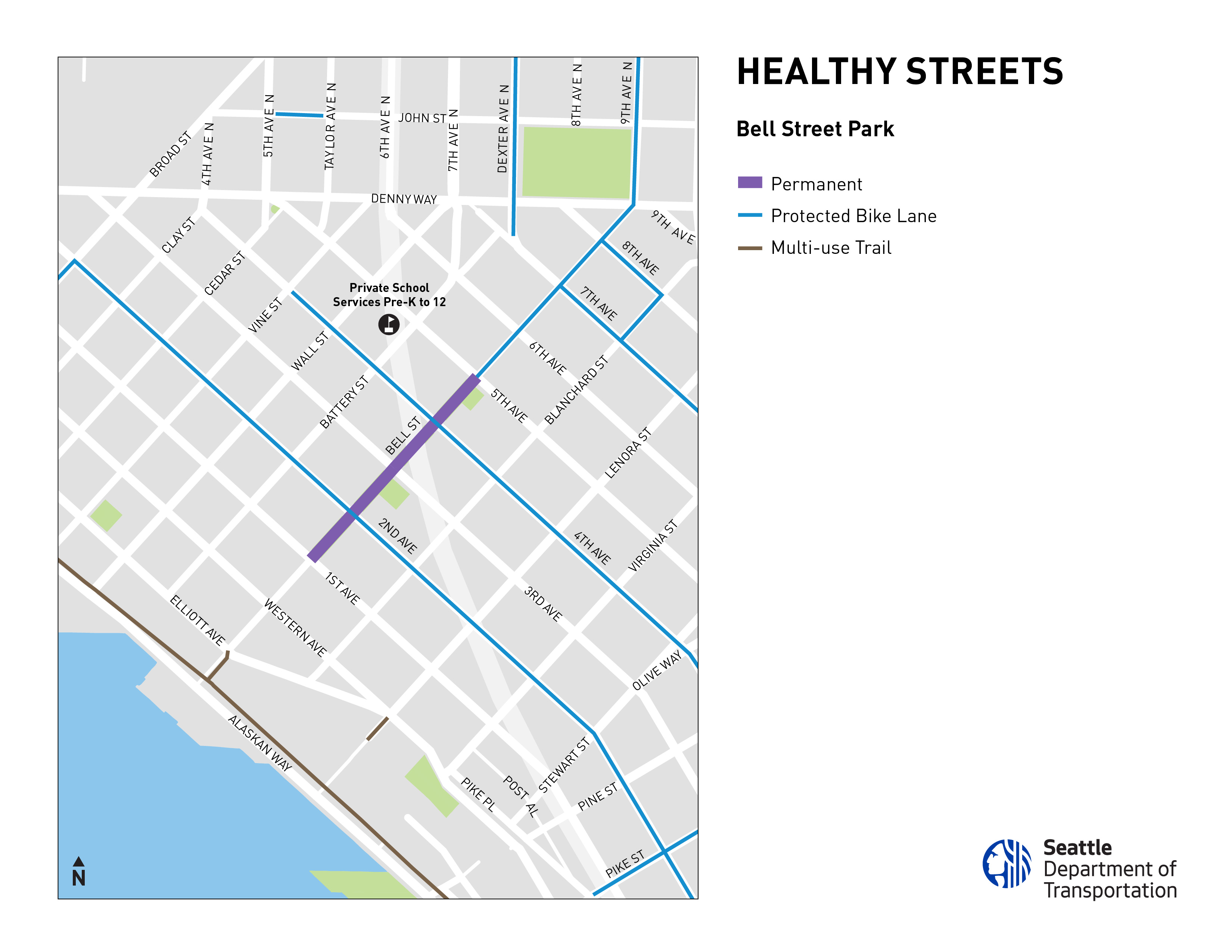 We've completed installation of permanent Healthy Street signs on Bell St, between 1st Ave and 5th Ave in July 2022.