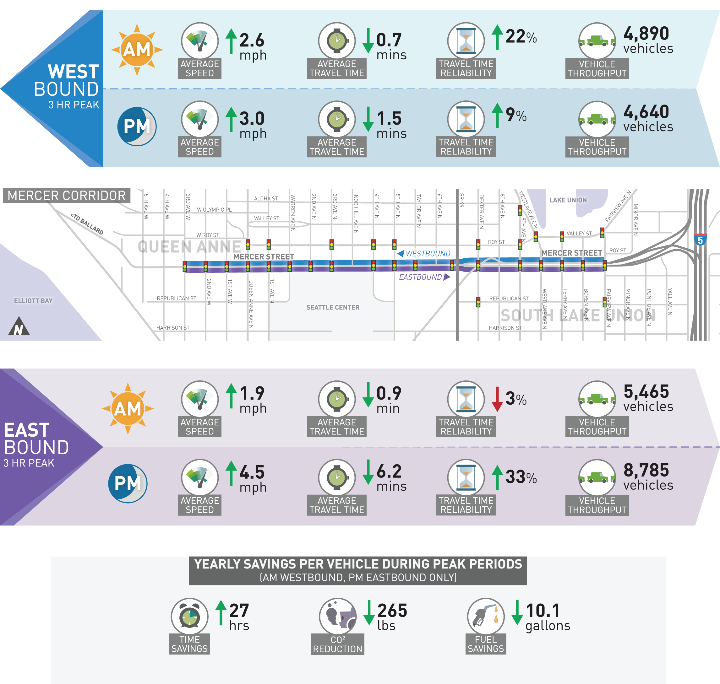 To assess the how well SCOOT is working, vehicle data is being collected daily and compared to historical averages. Reporting periods include morning and evening peak travel times (3 hours) in both the eastbound and westbound directions during the 5-day work week. These periods are when traffic volumes are at their highest. From the data received to date, the following changes have occurred.