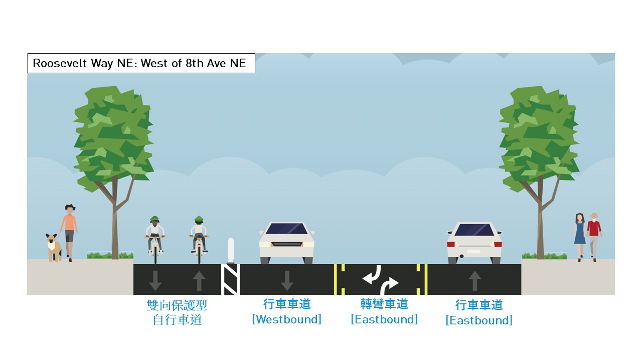 雙向保護型自行車道(8th Ave NE 往東之後變成單向自行車道)