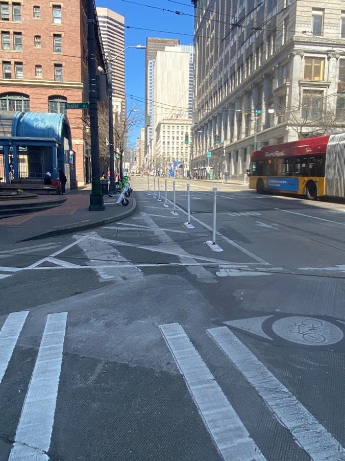 We initially wanted to test the efficacy of traffic control and separating pedestrians and cyclists from car traffic. So we installed paint and posts  to remove a northbound travel lane on 3rd Ave across Yesler Way. We also  removed the right-turn slip lane from southbound 3rd Ave to Yesler Way. The paint and posts we used created  temporary curb bulbs at street corners where pedestrians cross the street. Lastly, the project revised parking near the intersection and connected the Yesler Way’s protected bike lane to 4th Ave S along Dilling Way. In collaboration with King County Metro, we were able to monitor bus traffic and found that buses traveled efficiently with these changes. Based on the success of the pilot project, we are recommending permanent improvements.