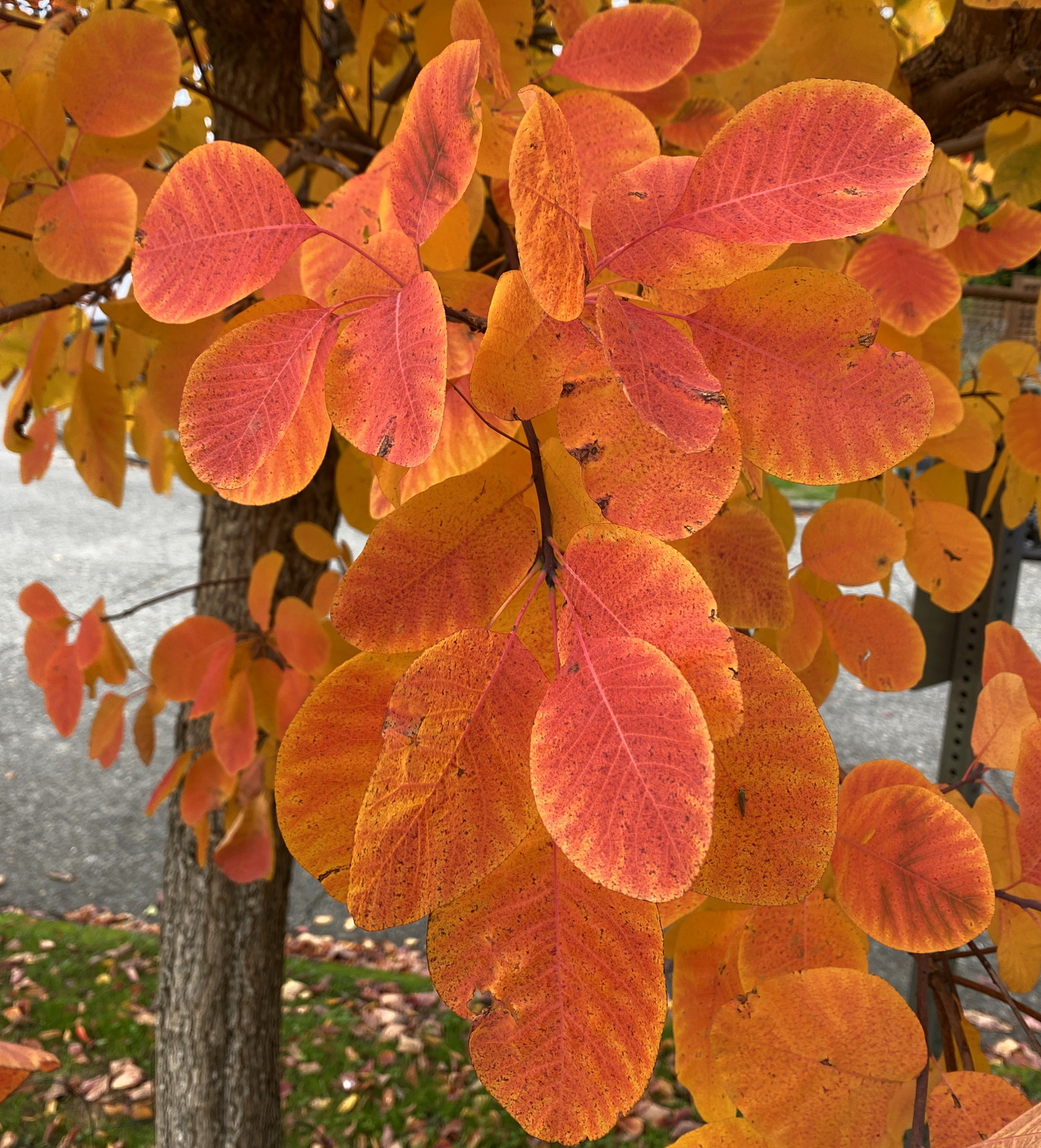 A small tree with many favorable attributes that does well in tough urban conditions. The blue-green leaves of summer turn to riot of yellow, orange, red, and reddish purple in the fall. After the flowers are spent in mid- summer, they produce little hairs that give the tree its “smokey” appearance. Older specimens develop scaly bark that is attractive in winter.