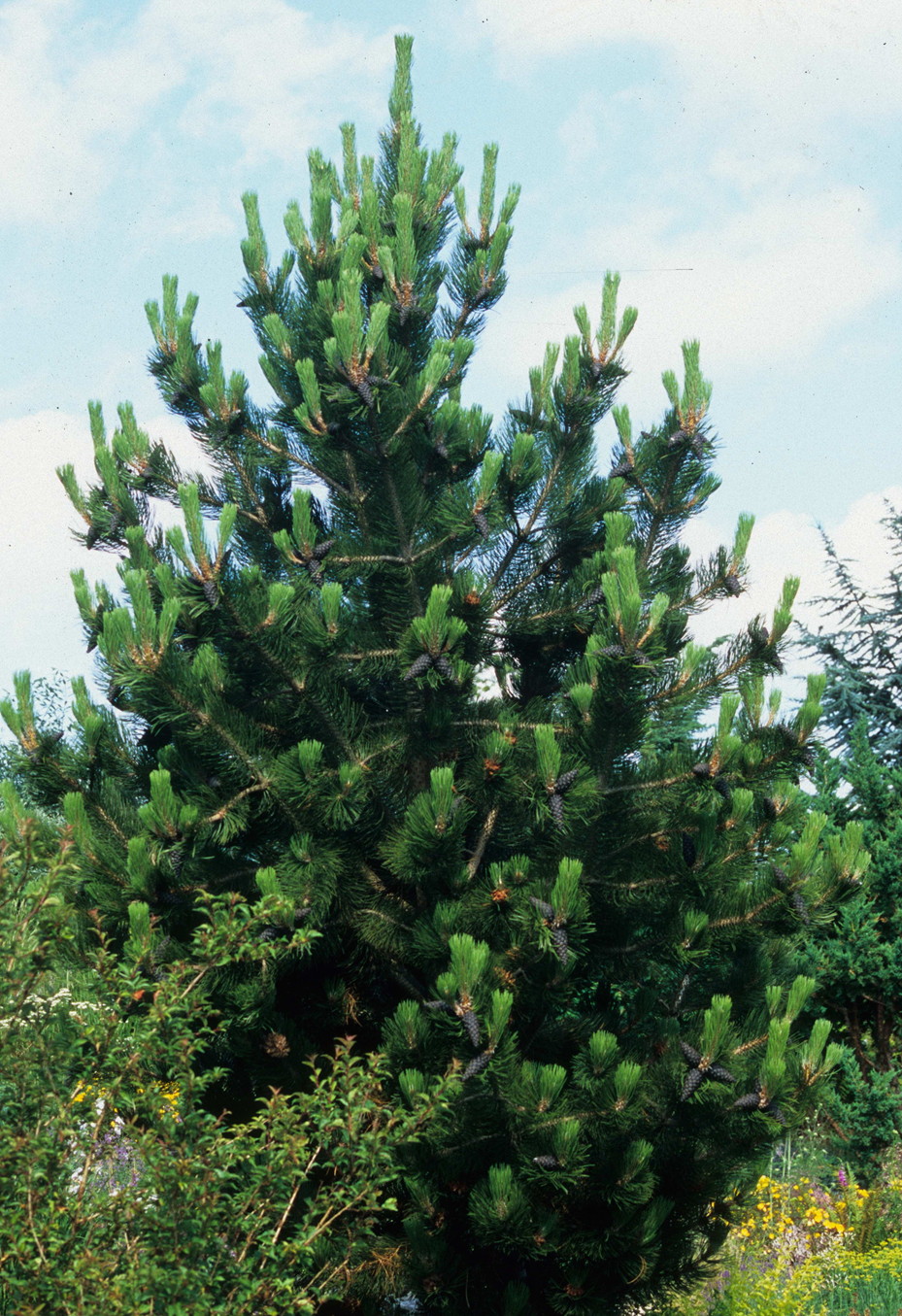 In youth this pine is slower growing with a dense, upright habit. With age it takes on a more open and layered habit yet keeps that pyramidal form. Some attractive details of this tree include upright bundles of dark green needles, bluish-purple young cones, and grayish-white young stems.