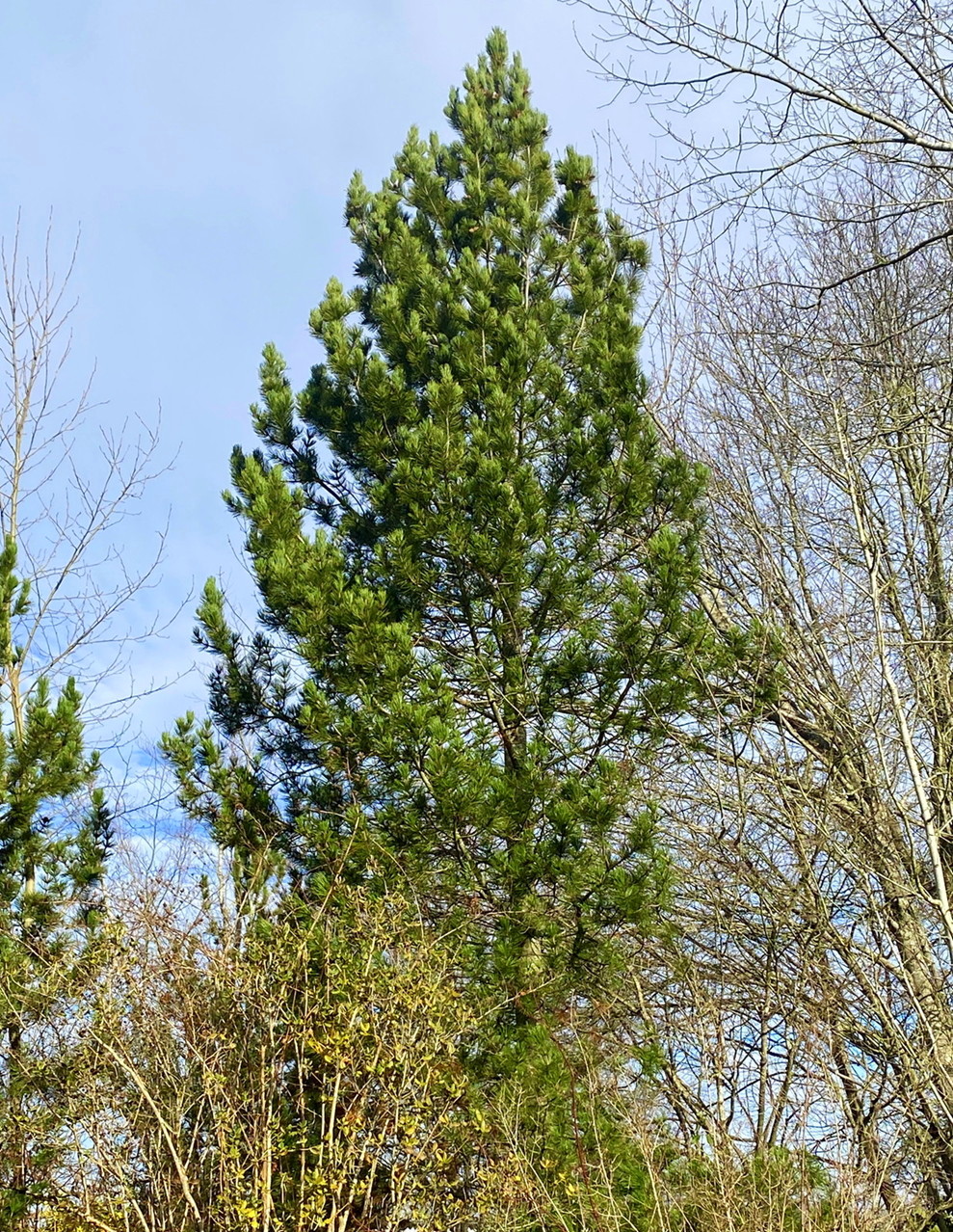 Dark green needles in bundles of two. Appear stiff and tufted at the ends of branches.