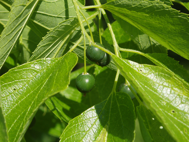 Small round green fruit that turn deep purple in late summer. Attractive to birds.