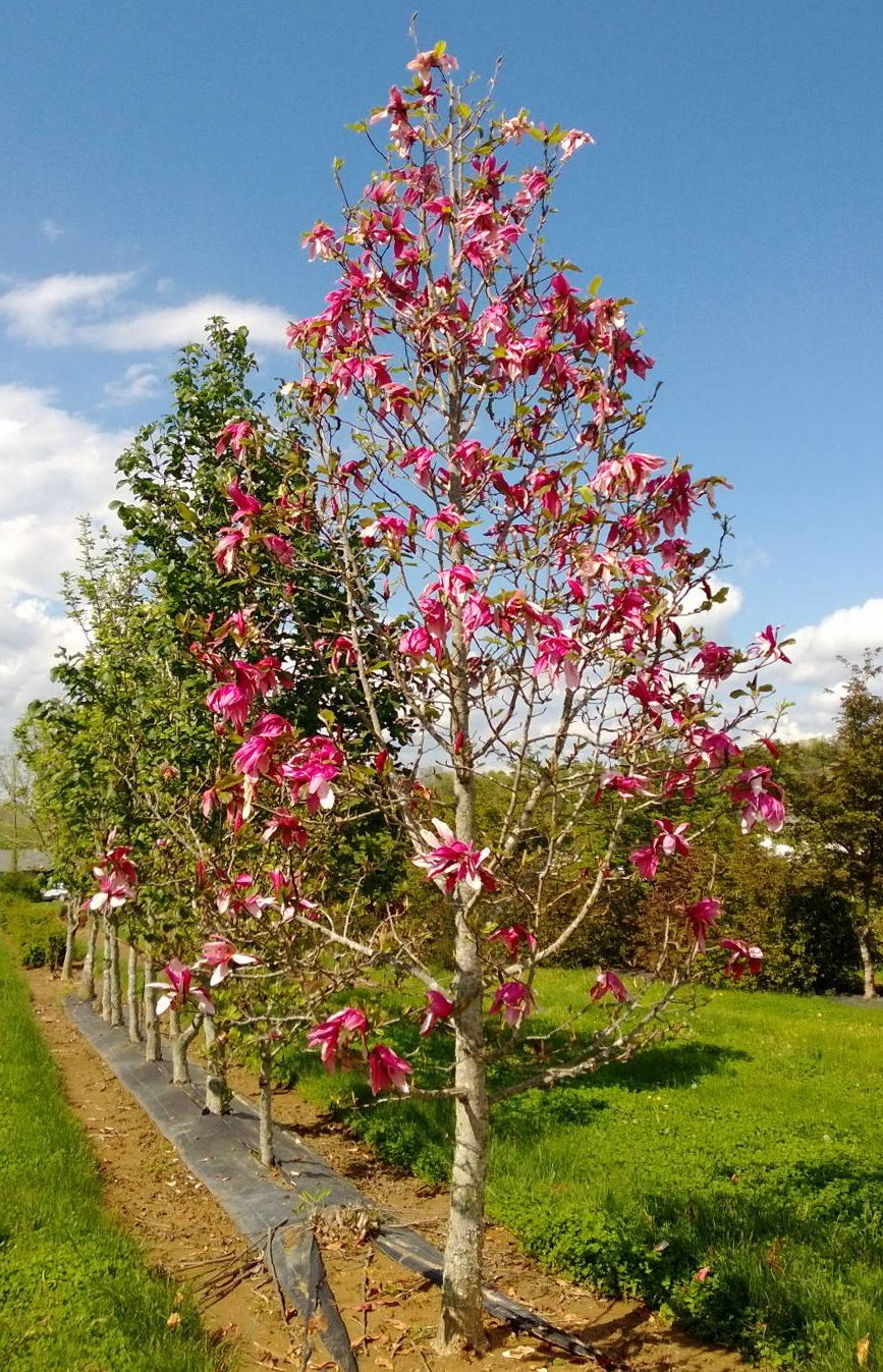 A beautiful street or yard tree with a strong central leader and upright form that works well under power lines. The deep pink flower buds open to large fragrant light pink flowers a month later than other saucer magnolias.