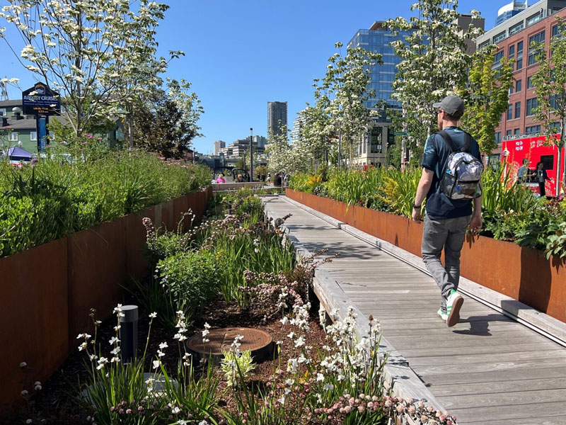 The park promenade is at the front porch of the new waterfront — providing a new linear park between Pioneer Square to the Seattle Aquarium and improving access to Seattle Ferry Terminal at Colman Dock and all the activities on the waterfront. The promenade joins the Overlook Walk on the north end and the rebuilt Railroad Way pedestrian plaza on the south end, providing access to the historic Pike Place Market and Pioneer Square neighborhoods.